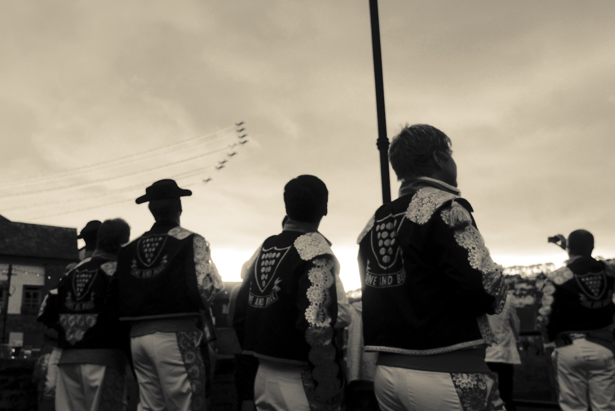 These two photos maybe should have gone up yesterday; they are from the Fowey Regatta Red Arrows display. Being steeply banked with narrow streets they put on a special display of aerial wizzardry to keep everyone guessing where they were coming from next. Quite a remarkable display, which left a rather sombre aftertaste when we discovered one of them had perished two days later at Bournemouth. We watched the display from the pub terrace in Polruan where these guys were singing Cornish songs in part, before taking part in the traditional Giant Pasty ritual - all very good fun!